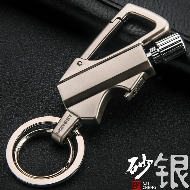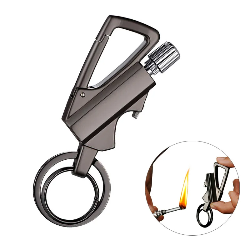 1. 3 IN 1 Survival Gear: integrated with a flint metal permanent match lighter, a beer bottle opener and an Keychain with rings.